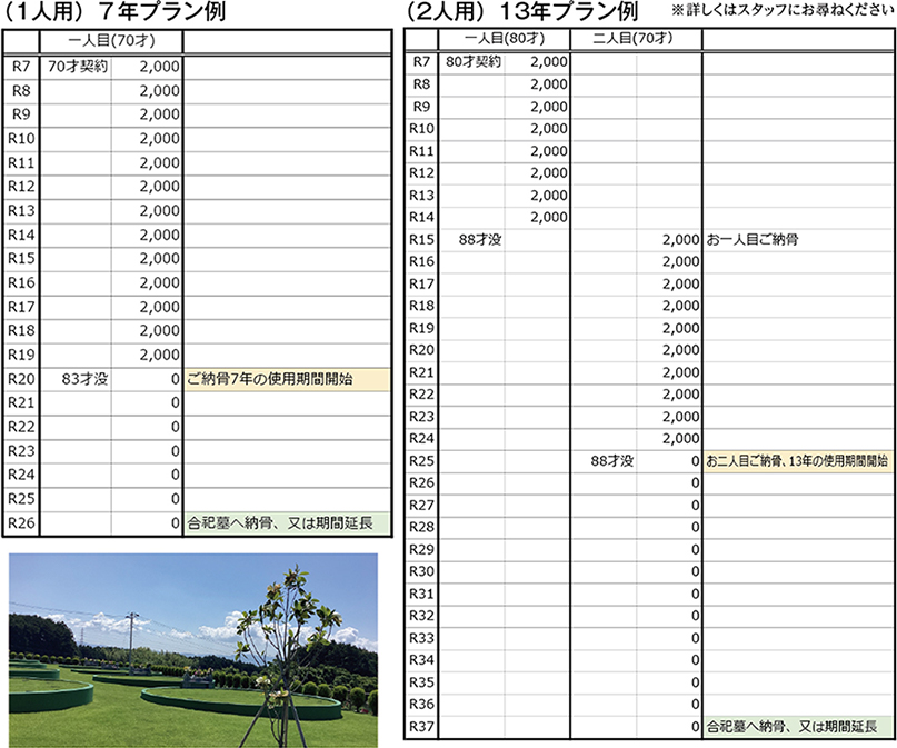 | 2人用 | 7年:350,000円 | 13年:400,000円 | 樹木維持費2,000円/年 |